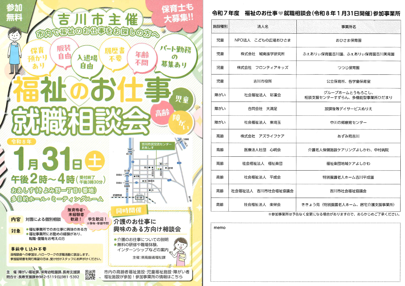 終了しました【吉川市主催 福祉のお仕事♡就職相談会】1月31日開催!