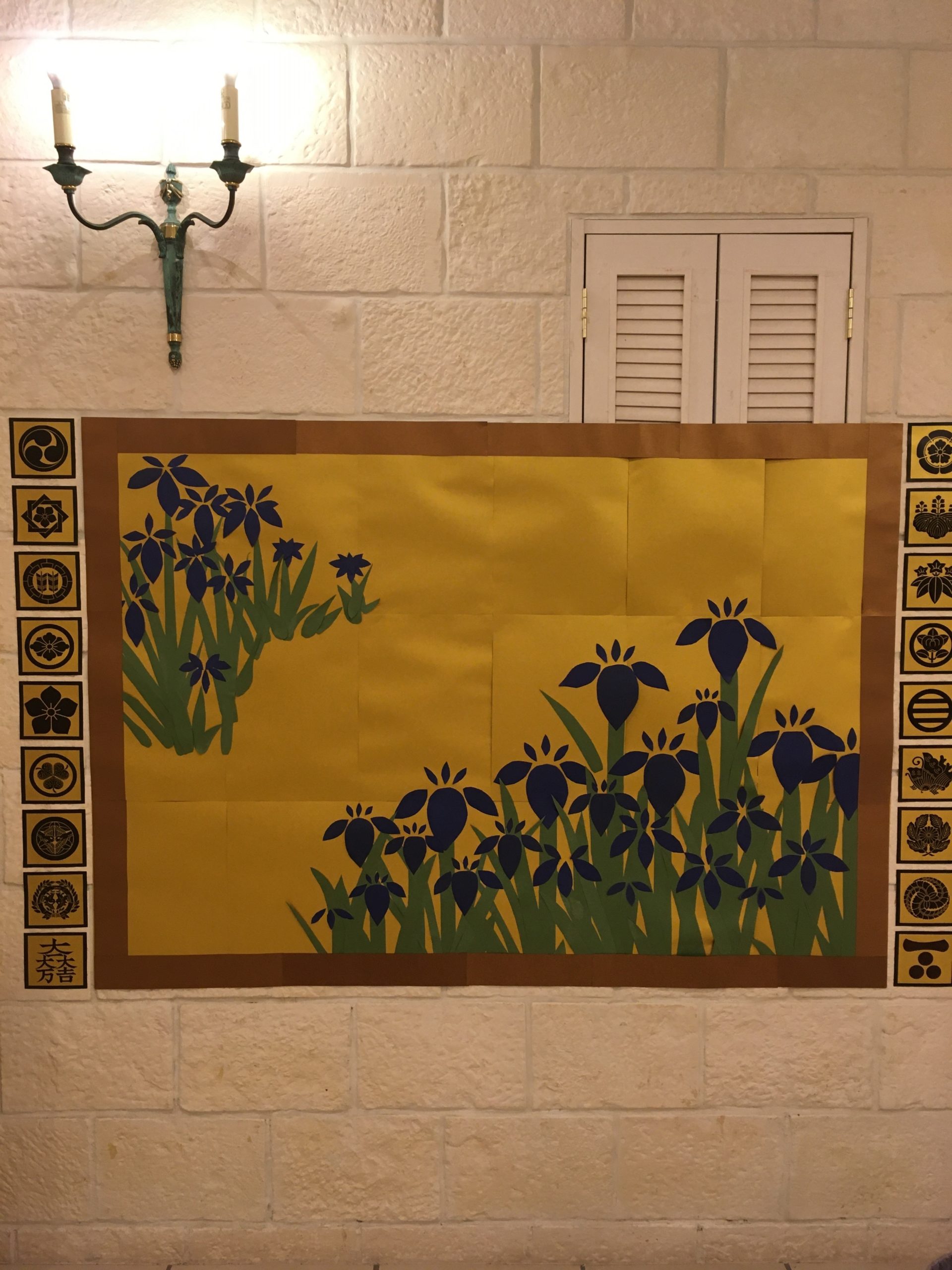 作品名燕子花と戦国武将の家紋制作者手作りクラブ参加ゲストとGTCスタッフ事業所有料老人ホーム グッドタイムリビング埼玉蓮田メッセージ尾形光琳の燕子花絵図をイメージして作ったオリジナル作品です -