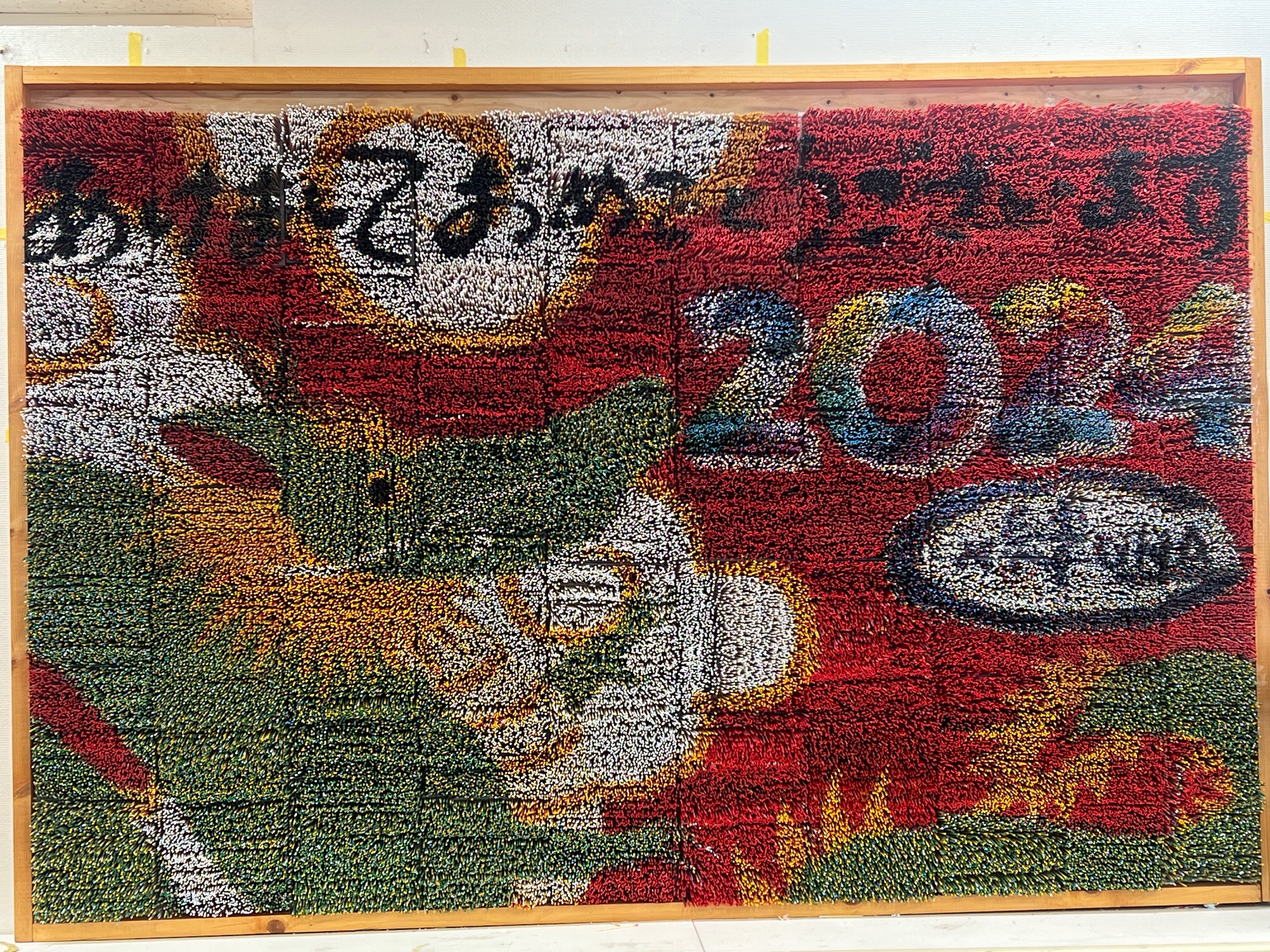 作品名2024つまようじアート『辰』制作者利用者様と職員事業所デイサービスセンター絆メッセージ職員が14万4500本のつまようじに色を塗りご利用者様が色の書かれたマス目(2mm×2mm)につまようじを1本、1本刺して作品を完成させました。作品の大きさも縦120㎝横180㎝の巨大つまようじアートになりました。毎年年末にその年の干支を作成し今年で6年連続で制作しています。 -
