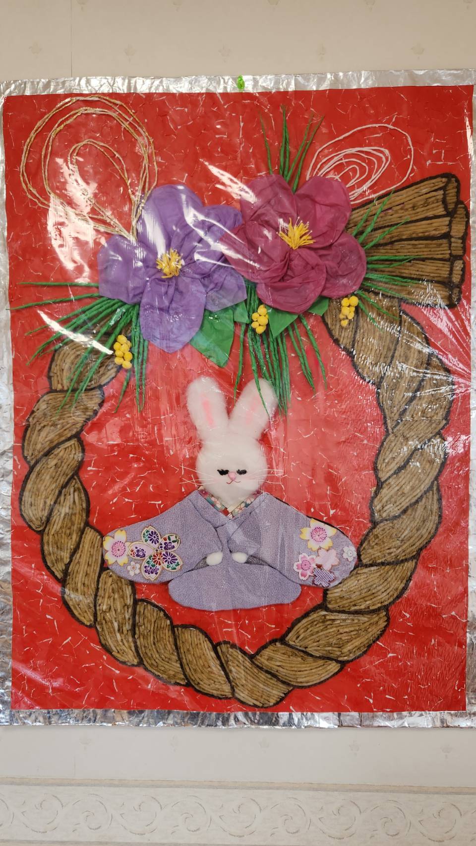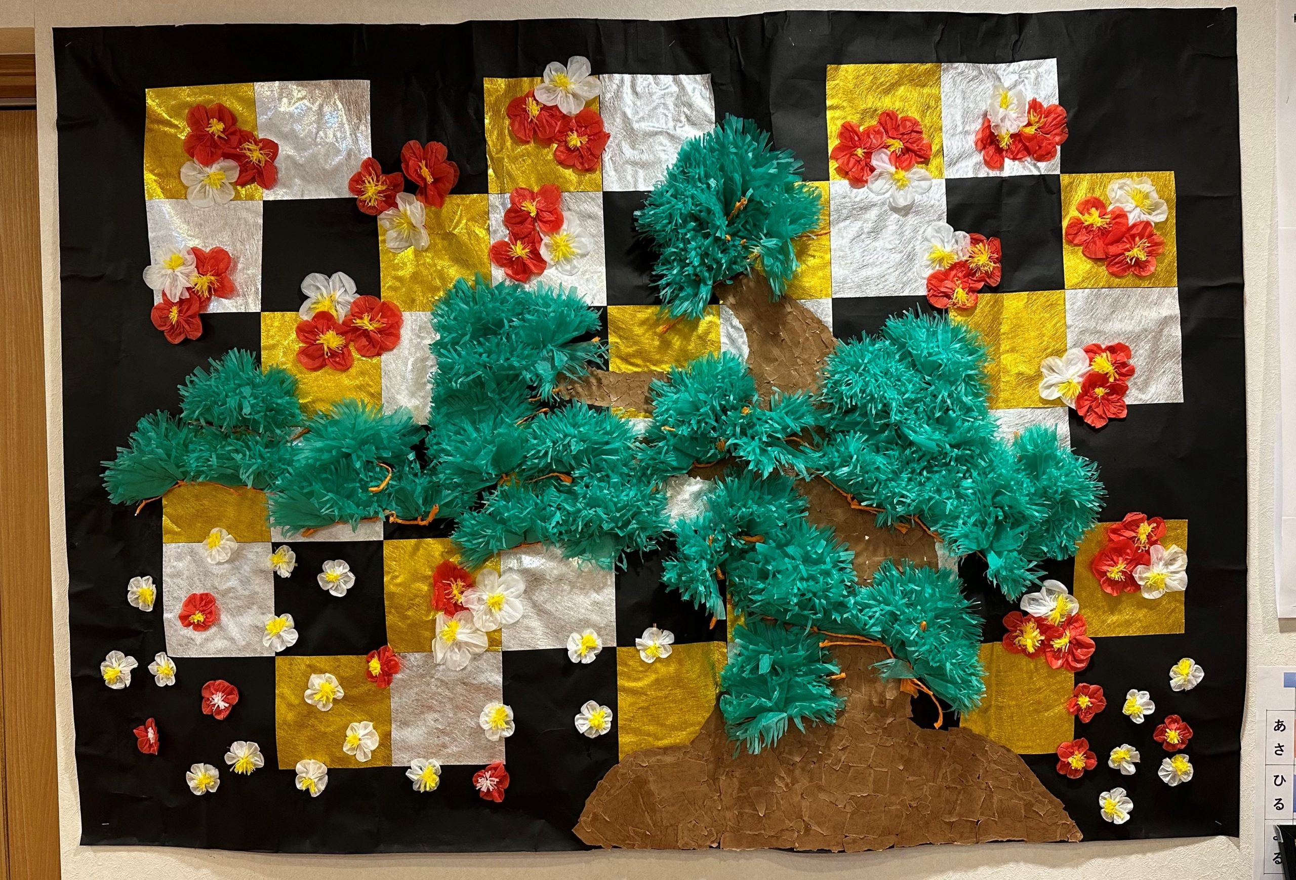 作品名和みの御祝い松制作者利用者様と職員事業所グループホーム和み 伊奈メッセージフロア真正面にいつも季節の作品を作成しています。