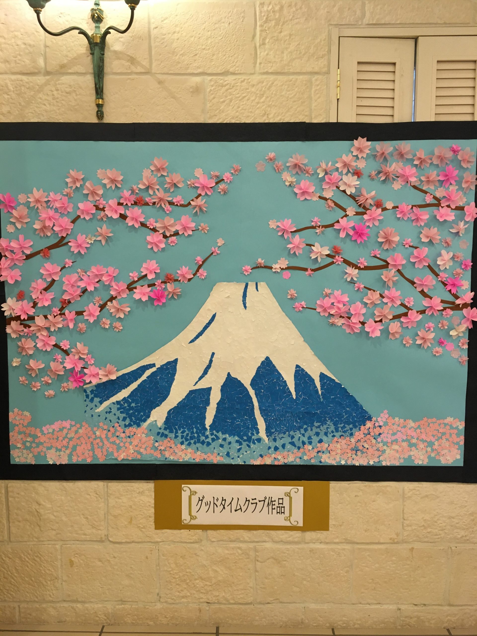 作品名山梨側から見た桜越しの富士山制作者手作りクラブ参加ゲストとGTCスタッフ事業所有料老人ホーム グッドタイムリビング埼玉蓮田メッセージ「初富士ご来光」を貼り絵や切り絵、折り紙を使ってリメイクしました -