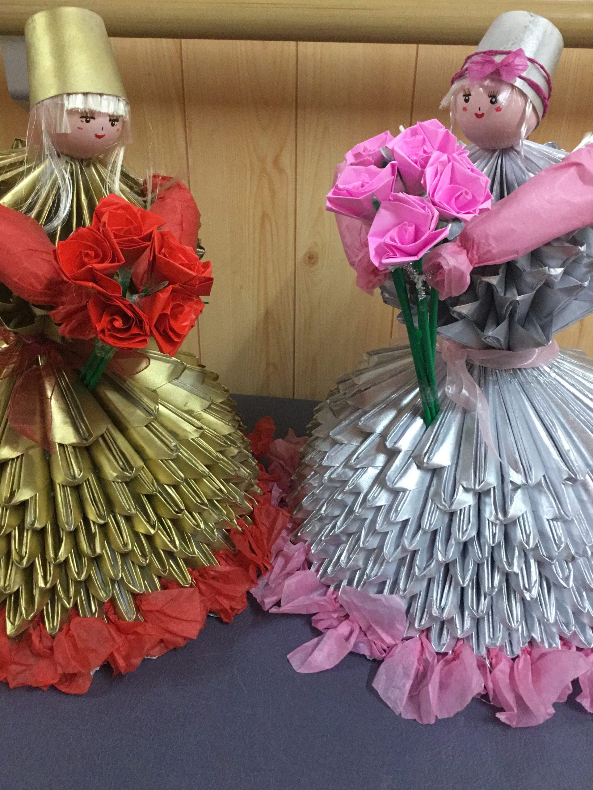 作品名ふわふわドレスの西洋人形制作者チームなでしこ(3階.4階利用者様とOT)事業所介護老人保健施設 なでしこメッセージ三角折り紙で西洋人形を作成しました。身体部分、ドレス、花束と分担しながら作成した力作です。顔はけん玉、髪の毛は100円の付け髪をカットして両面テープで貼り付けてウィッグを作ったり、こだわりぬいた力作です!! -