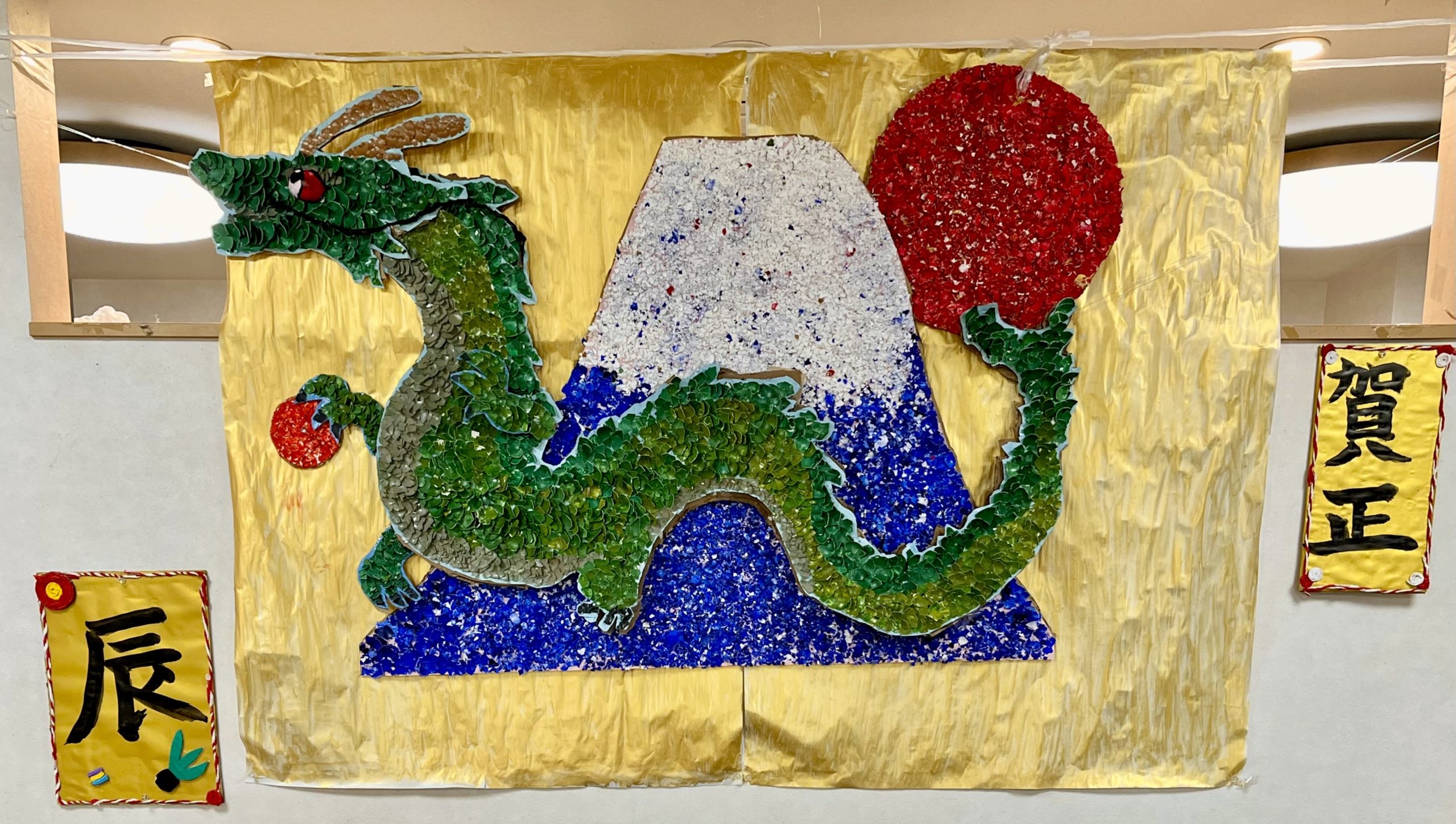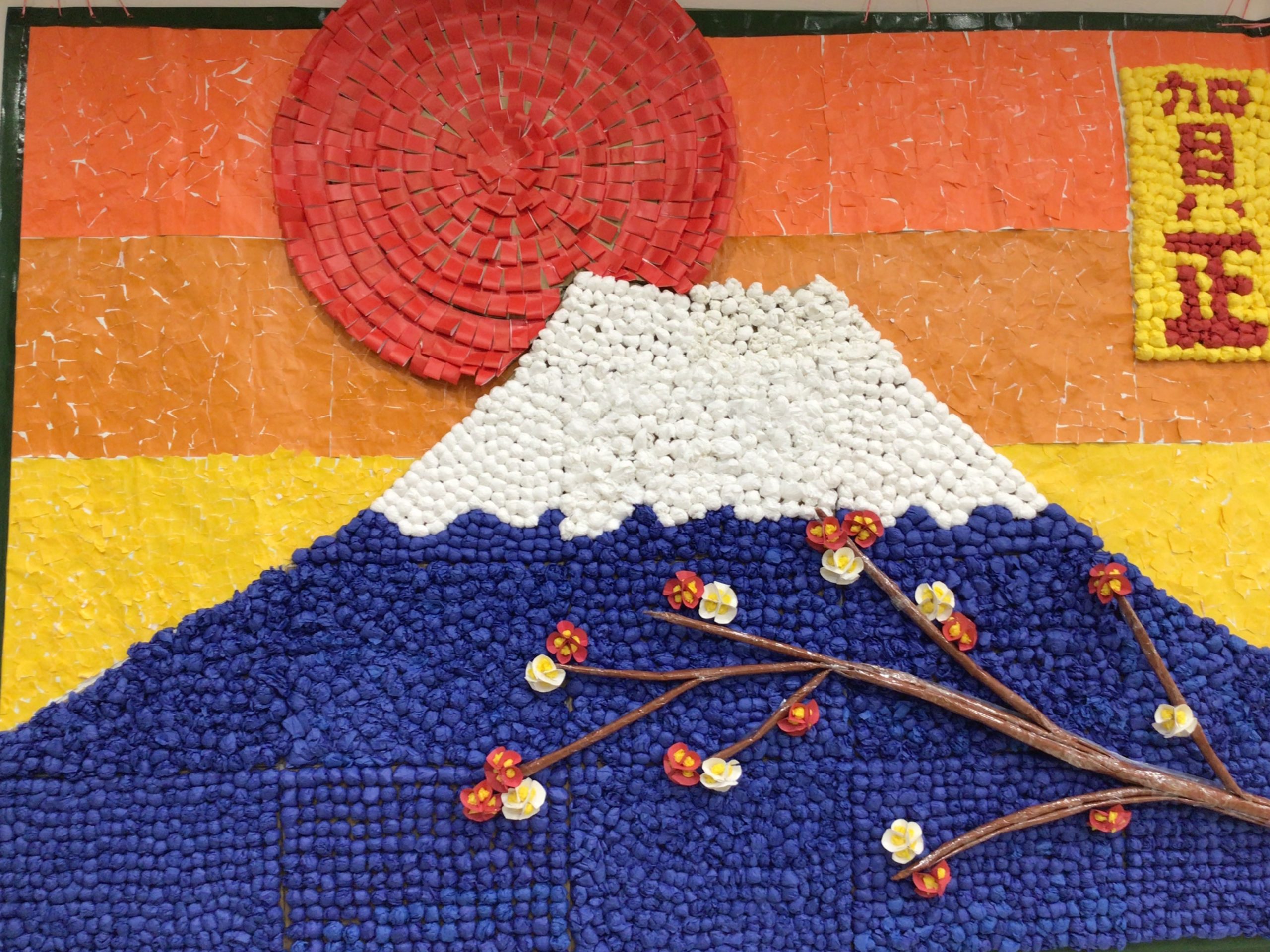 デイサービスセンター志木メッセージ職員が毎月テーマを決めて、ご利用者様が中心になり 制作しています。1カ月かけ新年にふさわしく初日の出をイメージし作品を仕上げました。