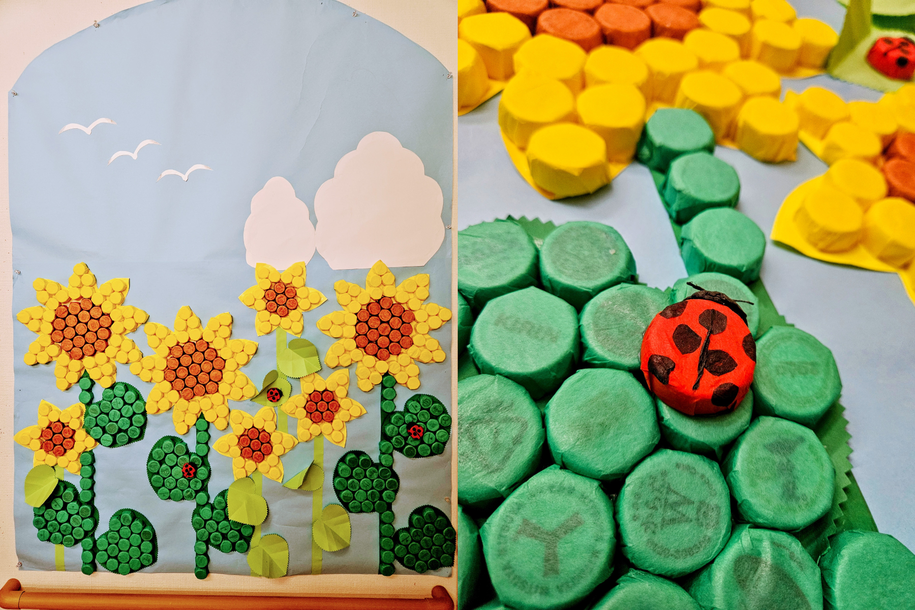 作品名ひまわりの花制作者ご利用者と介護職員事業所グループホーム ひまわりの里メッセージペットボトルのキャップをお花紙で包み作成しました。てんとう虫もいますよ。 -