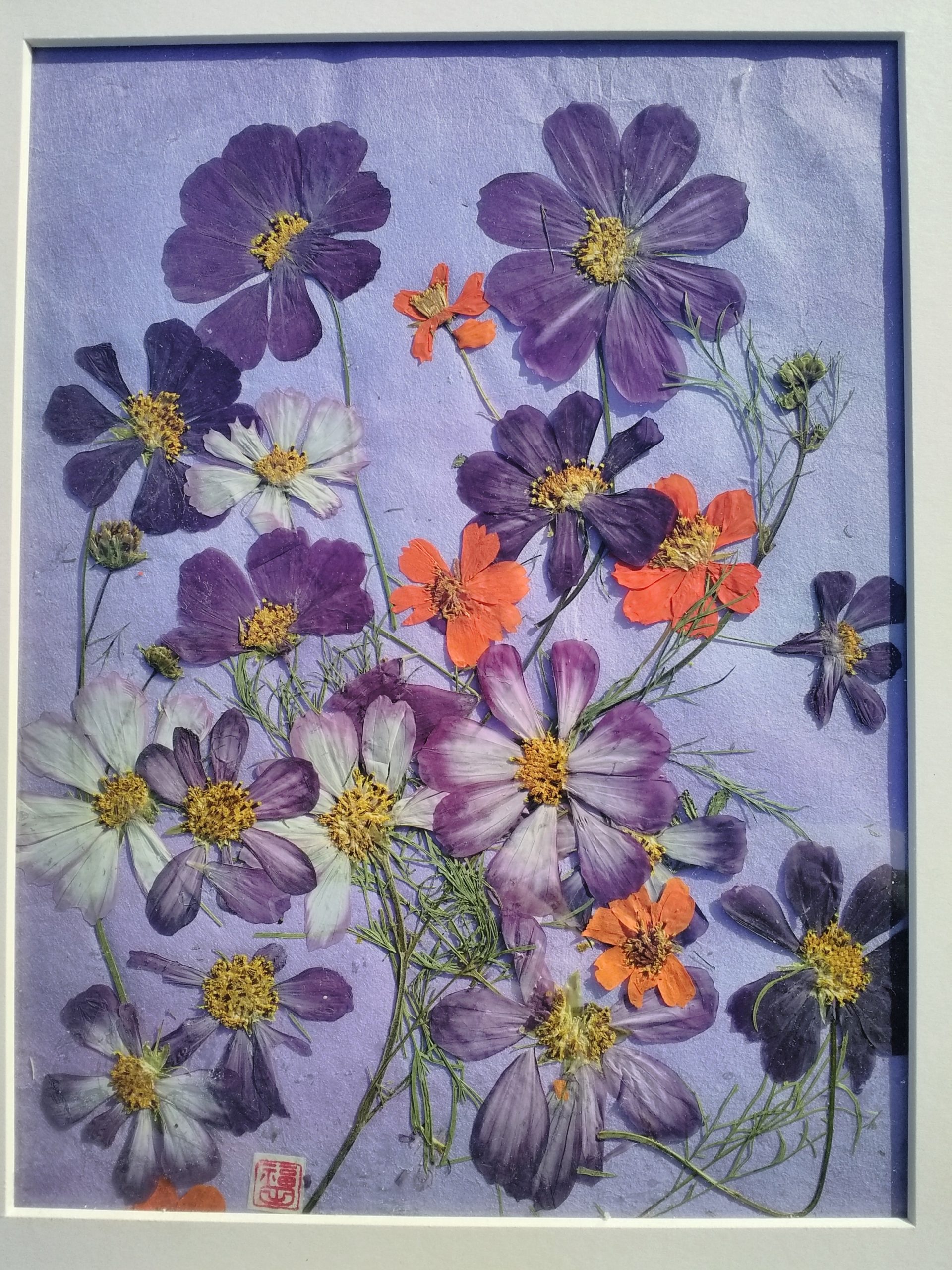 作品名秋桜制作者F・Fさま事業所リハビリデイサービスなめがわメッセージ脳梗塞をしてから手が利きづらく、なかなか再開できなかった押し花。事業所に咲いた秋桜を見て「素敵な色だから貰える?」と言われたため、「押し花にして下さるなら!」とお願いしたところ、とても素敵な作品を作って下さいました。本人としては納得いかない出来との事ですが、一歩踏み出すきっかけになった作品です。