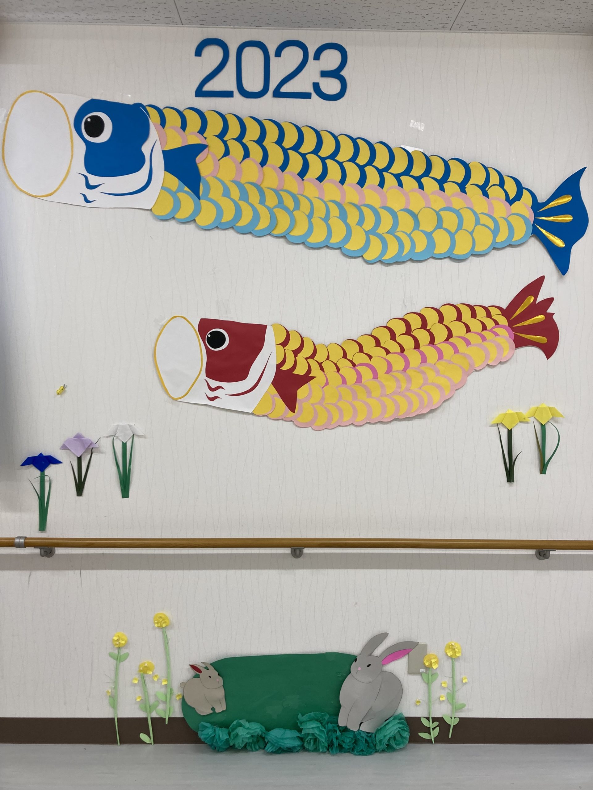 作品名高く!泳ぐ!制作者リハデイなめがわ(利用者さんと職員)事業所リハビリデイサービスなめがわメッセージ職員が作った鯉の土台に、利用者さんが作った鱗を貼り重ねて作った大作です!(当時の)干支のうさぎがチョコンと座っているところもかわいいポイントです。 -