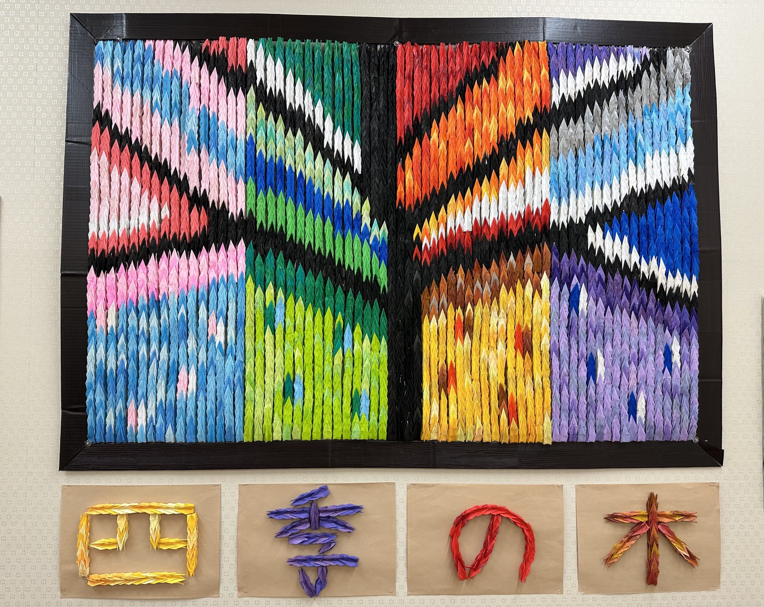 作品名四季の木制作者利用者様有志+全職員事業所アクアメイト所沢 通所介護事業所メッセージ小さな折鶴を重ねて四季をイメージした樹の壁画を作りました。絵を作る為に作った折鶴は3082羽!!!利用者様・職員一丸となって作成した大作です。 -