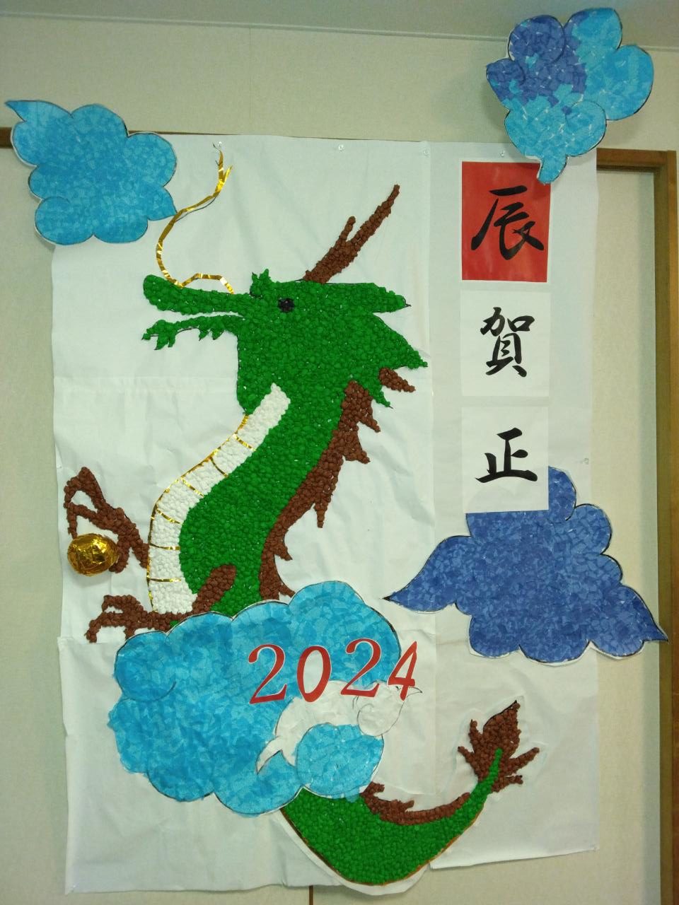 作品名龍(辰)立つ!制作者あゆみ脚折 利用者様・スタッフ一同事業所まごころの家 あゆみ脚折メッセージ今年の干支にあやかり、龍(辰)の壁飾りを作成しました。細かい作業がたくさんありましたが、天に向かって立ち上がる龍に事業所の皆さんの願いをのせて、今年1年元気に過ごしていくとの思いで一丸となって作り上げました。 -